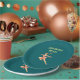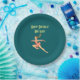 Personalized Happy Birthday plate. Great for a skating theme party. A retro style vintage image of a female figure skater. Dressed in an elegant and silky coral pink figure skating outfit. With matching coral pink skates and long elegant gloves. Her long brown ponytail swinging up in the air as she jumps high, in a classic figure skater pose. Illustration is set on a dark forest green background.