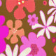 Floral illustration wallpaper design. Pink, orange and off-white, hand-drawn flowers appear diagonally in this pattern. Shown over a rich, dark chocolate brown background color. Perfect for giving a room a colorful, retro, vibe.
