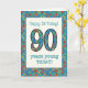 A pretty Age-specific Birthday Card for a Ninety-year-old, with the number 90 and the border filled with a colourful retro floral pattern on a teal background. The floral pattern is part of the Posh & Painterly 'Granny Print' collection, from a hand-painted paper collage by Judy Adamson. This design will fit all Greeting Card sizes.
