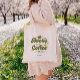 An elegant green and gold "books + coffee" tote bag, designed with retro lettering and florals, perfect for book lovers and coffee lovers. Features a customization section for you to add your name, initials, or custom text.