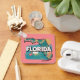 Retro styled square aluminum keychain features Florida vignette complete with flamingo and state silhouette on pink background. Add your own info on back.
