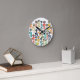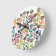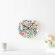 This clock has a mid-century modern design a retro flower garden in a retro color palette or red, orange, yellow, green, and blue.