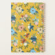 Pretty floral planner printed with an eye catching floral pattern in a strong mustard yellow with retro flowers in blush, coral, and blue with lots of blue and green leaves, and pale berries. Add your name to the dark blue label.
