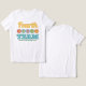 Fourth grade team t-shirt personalized with the school name. The grade is customizable, in case you want to change it to first grade, second grade, third grade and so on. GRADE is printed on simple graphics of retro flowers in a retro color palette.