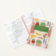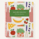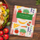 Charming recipe notebook with a pattern of food and kitchen tools printed on the cover with cheese, strawberries, olives, apples, basil, whisks, and cutting boards. Add your own text on a green label.