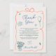 Express your gratitude with our Retro French Blue, green pink and beige Bridal Shower Thank You Card! This charming design features a delightful array of vintage-inspired elements, including balloons, cameras, hearts, and a beautiful bouquet of flowers in a vase. Framed by a whimsical squiggly wavy ribbon, each detail adds warmth and personality to your heartfelt message. With customizable colors and a hand-written font, this card is the perfect way to convey your thanks in style. Let your appreciation shine with this unforgettable card!