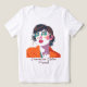 This vibrant vector portrait showcases a stylish person with tousled dark brown hair wearing oversized yellow-tinted glasses that reflect a hint of teal. Their striking look is completed with bold red lips, prominent pink blush accents, and elegant gold hoop earrings. The illustration features a color-blocked aesthetic with a vivid orange blazer over teal accents, set against a white background with purple color blocking on the neck. The composition masterfully balances retro 70's inspiration with contemporary graphic design techniques, creating a fashion-forward image that feels both nostalgic and modern. The clean lines and carefully selected color palette give this portrait a sophisticated yet playful vibe perfect for fashion, beauty, or lifestyle branding.