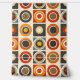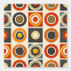 This artwork features a vibrant and bold pattern of concentric circles and squares arranged in a structured grid format. The design showcases a retro-inspired color palette of warm oranges, deep browns, yellows, and creams, creating a nostalgic yet modern feel. Each circle is perfectly centered within its square, with the repeating patterns creating a rhythmic and balanced composition. The use of strong, contrasting colors and geometric shapes gives the piece a dynamic and visually engaging appearance, reminiscent of mid-century modern design.