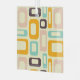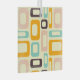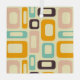 Retro geometric pattern with overlapping rectangles and ovals in orange, teal, pink, and brown on a light beige background, creating a playful, vibrant mood.