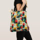 This tote features a vibrant retro geometric pattern, showcasing a mix of rectangles, circles, and lines in red, yellow, green, and blue tones against a neutral background. Perfect for those who love abstract designs and vintage-inspired styles, this bag adds a pop of color and artistic flair to any outfit.