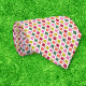 Add some joy to your Christmas outfit with this patterned necktie featuring a simple geometric pattern in a retro 1970s color palette of red, lime green, orange, pink and green against a white background. The reverse side has a coordinating diagonal striped pattern.