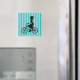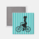 A cute retro graphic illustration. A silhouette of a woman in a ponytail, wearing a dress and riding a bicycle. The background is a turquoise blue striped pattern with alternating light and dark tones.