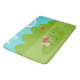 This Retro Golfer Bath Mat is more fun than a day on the greens. The 1960's style, minimalist art design is anything but par for the course. It features a lone golfer on a lush, green fairway. The mid century modern golfer is making a real fashion statement in his stylish, plaid, golf pants and fuchsia shirt. The blond, fit, weekend warrior is on his hands and knees attempting to line up a shot. Or maybe he's attempting to give the ball a nudge in the direction of the hole. Does it really matter? At his side, we see a single, golf club. In front of him, is the elusive hole, with a red flag, which is taunting him. The background features a green line of cartoon trees, an aqua sky and two, white, kidney bean shaped clouds. This design is sure to be a hole in one with your favorite golf pro.