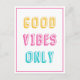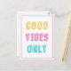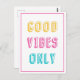 An inspirational postcard featuring the affirmation 'Good Vibes Only'. Warm and uplifting. The colourful typographic design features retro 3D text.