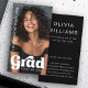 Modern, trendy graduation photo networking profile card with the text "grad" in a retro, bold font as an overlay over your photo on the front. Add your name, year, school and photo. Black back. You can change the background color, fonts and font colors, move and resize elements with the design tool.
