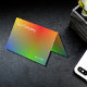 Folded Business card design with retro gradients of blue and green and a tie-dye-like neon orange With a psychedelic twist, you'll have your clients tripping back to a time before pixels and screens ruled the world. Unique design by Alma Wad.