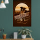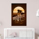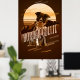 Striking retro-style poster design of a border collie with a background of mountains and large sun graphic all in monochrome shades of gold through brown. A large decorative font names the dog breed. Search ID754 to see other color options and additional dog breeds in this style.