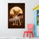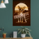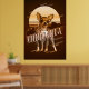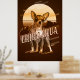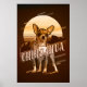 Striking retro-style poster design of a Chihuahua with a background of mountains and large sun graphic all in monochrome shades of gold through brown. A large decorative font names the dog breed. Search ID754 to see other color options and additional dog breeds in this style.