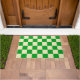 Cool fresh checkered pattern design, modern interior design decor for home, living room, nursery room, kids room. Checkered colorful curtains, rug, phone case. Checkered 70s and 60s trend design idea. Green and muted white checkers