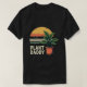 graphic style. The central focus is a potted plant with broad, green leaves, situated to the right of the composition. The plant is depicted in a realistic manner with detailed leaf veins. The background features a circular design with horizontal stripes in various shades of green, orange, and white, creating a retro, vintage feel. The stripes are uneven and slightly rough, adding to the distressed appearance. The entire background is set against a dark teal backdrop. At the bottom of the image, the text "PLANT DADDY" is prominently displayed in bold, white, uppercase letters, with a slight shadow effect to make it stand out further. The overall style of the image is reminiscent of 1970s or 1980s graphic design, with a modern digital twist. The composition is simple yet effective, with a clear focus on the plant and the retro background, creating a visually appealing and engaging piece, dark teal backdrop.