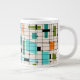 This Retro Grid and Starbursts Jumbo Mug is where vintage style meets modern day. It features a cream colored background with kitschy, off kilter squares and rectangles in teal, turquoise, This light blue, orange, and avocado green. The whimsical blocks of color are overlayed are worked into some of the grid intersections. There are also black rectangles with black vertical and horizontal lines forming a grid pattern. Black starburst designs and squares placed sporadically throughout this mid century modern tapestry of color. Grab your go-go boots and bell-bottoms and enjoy this throwback to the 1960s.
