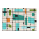 This customizable Retro Grid and Starbursts Laminated Placemat is where vintage style meets modern day. It features a cream colored background with kitschy, off kilter squares and rectangles in teal, turquoise, This light blue, orange, and avocado green. The whimsical blocks of color are overlayed are worked into some of the grid intersections. There are also black rectangles with black vertical and horizontal lines forming a grid pattern. Black starburst designs and squares placed sporadically throughout this mid century modern tapestry of color. The opposite side is turquoise and can be personalized. Grab your go-go boots and bell-bottoms and enjoy this throwback to the 1960s.