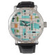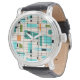 This Retro Grid and Starbursts Men's Watch is where vintage style meets modern day. It features a cream colored background with kitschy, off kilter squares and rectangles in teal, turquoise, This light blue, orange, and avocado green. The whimsical blocks of color are overlayed are worked into some of the grid intersections. There are also black rectangles with black vertical and horizontal lines forming a grid pattern. Black starburst designs and squares placed sporadically throughout this mid century modern tapestry of color. Grab your go-go boots and bell-bottoms and enjoy this throwback to the 1960s.