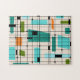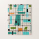 This Retro Grid and Starbursts Puzzle is where vintage style meets modern day. It features a cream colored background with kitschy, off kilter squares and rectangles in teal, turquoise, This light blue, orange, and avocado green. The whimsical blocks of color are overlayed are worked into some of the grid intersections. There are also black rectangles with black vertical and horizontal lines forming a grid pattern. Black starburst designs and squares placed sporadically throughout this mid century modern tapestry of color. Grab your go-go boots and bell-bottoms and enjoy this throwback to the 1960s.