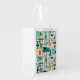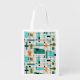 This Retro Grid and Starbursts Reusable Grocery Bag is where vintage style meets modern day. It features a cream colored background with kitschy, off kilter squares and rectangles in teal, turquoise, This light blue, orange, and avocado green. The whimsical blocks of color are overlayed with black vertical and horizontal lines forming a grid pattern. Black starburst designs are worked into some of the grid intersections. There are also black rectangles and squares placed sporadically throughout this mid century modern tapestry of color. Grab your go-go boots and bell-bottoms and enjoy this throwback to the 1960s.