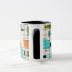This Retro Grid and Starbursts Ringer Mug is where vintage style meets modern day. It features a cream colored background with kitschy, off kilter squares and rectangles in teal, turquoise, This light blue, orange, and avocado green. The whimsical blocks of color are overlayed are worked into some of the grid intersections. There are also black rectangles with black vertical and horizontal lines forming a grid pattern. Black starburst designs and squares placed sporadically throughout this mid century modern tapestry of color. Grab your go-go boots and bell-bottoms and enjoy this throwback to the 1960s.