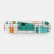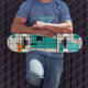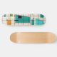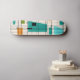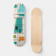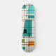 This Retro Grid and Starbursts Skateboard is where vintage style meets modern day. It features a cream colored background with kitschy, off kilter squares and rectangles in teal, turquoise, This light blue, orange, and avocado green. The whimsical blocks of color are overlayed are worked into some of the grid intersections. There are also black rectangles with black vertical and horizontal lines forming a grid pattern. Black starburst designs and squares placed sporadically throughout this mid century modern tapestry of color. Grab your go-go boots and bell-bottoms and enjoy this throwback to the 1960s.