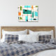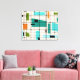 This Retro Grid and Starbursts Wrapped Canvas is where vintage style meets modern day. It features a cream colored background with kitschy, off kilter squares and rectangles in teal, turquoise, This light blue, orange, and avocado green. The whimsical blocks of color are overlayed are worked into some of the grid intersections. There are also black rectangles with black vertical and horizontal lines forming a grid pattern. Black starburst designs and squares placed sporadically throughout this mid century modern tapestry of color. Grab your go-go boots and bell-bottoms and enjoy this throwback to the 1960s.