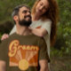 This fun and groovy wedding t-shirt is perfect for the groom. It features a retro sun design with 70's typography. The color scheme includes terracotta, orange, mustard-yellow, and beige. It's playful, unique, boho, and hippie.