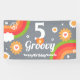 Cute girly retro 5 is groovy birthday invitations. Popular retro rainbow, stars, flowers, and 60s style font. Available as a digital download printable.