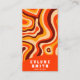 A Vintage retro Psychedelic colorful liquid business card. That features a handmade groovy pattern boho abstract wavy shapes lines .In elegant chic orange and brown and beige . Modern yet it has nostalgic seventies vibes and colors and groovy fonts. With customizable name and profession and QR code.