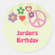 Retro theme sticker great for a young girl’s birthday party. It features typical icons from the 70’s such as the peace sign, flower and star. Colorful and cute design great for a fun event. Use it for party favors or to seal envelopes.