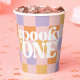 This custom first birthday party cup features a colorful pastel checkered design that perfectly capture the excitement and fun of a 1st birthday celebration. It features a retro-inspired aesthetic and the phrase "spooky one" for a halloween themed birthday party.