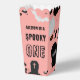 Halloween-themed favors bag with a ghost, black cat, spider, bat, candy, candles, spider, and pumpkins for a first birthday. "Spooky One's Birthday bag!""Easily PERSONALIZE this design with your information!" states the text. If you're seeking for MATCHING ITEMS, browse our matching selection or shop.