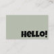 Make your business simply fun and cleanly elegant . A minimalist neutral pistachio sage green retro groovy hello unique business card template . As you see it features plane pale sage green background. And black elegant groovy font of hello in the front . And in the back you have the full name and title .And social media icons and custom QR code with other info. You can simply customize it by clicking in the blue Personalize button and then change the info. What you waiting for!! Go a head and grab it . we guarantee you the amazing quality and fast shipping.