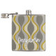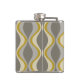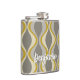 A mod patterned gold flask with a place for a simple monogram. The taupe, grey and gold design has a groovy organic wave pattern. A minimal look in subtle colors with a simple serif font for a monogram.