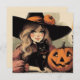 Send a little vintage magic through the mail this spooky season with this delightful 5.25" x 5.25" square greeting card, featuring a retro illustration that brings together all the best elements of Halloween charm. At the center of the design is a pretty witch, poised and relaxed, wearing a tall, classic pointy witch hat that adds just the right amount of enchantment to the scene. Beside her sits a sleek black cat, her loyal companion, and a glowing jack-o’-lantern that adds warmth and festive spirit to the composition. Rendered in a nostalgic color palette and drawing inspiration from 1960s and 1970s illustration styles, this artwork captures the heart of vintage Halloween with a playful yet elegant touch.