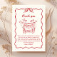 Express your gratitude with charm and style using this hand-illustrated thank you card, perfect for newlyweds looking to send a memorable “thank you” to friends and family. This whimsical design features a vintage-inspired wedding car trailing heart-shaped balloons, symbolizing the love and joy from your special day. Framed in a wavy, delicate border and topped with a sweet bow, this card captures a sense of timeless romance and casual elegance. Crafted in a vibrant red color, it brings warmth and personality to your message, making it the perfect choice for saying “thank you” in a way that’s unique and heartfelt.