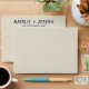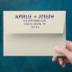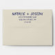 A retro modern hand written bright colorful wedding envelope. Which features bold bride and groom's names in blue color. And personalized return address . On simple pale beige cream vintage color background. Which suits the whole wedding suite.