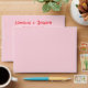 A retro modern hand written bright colorful wedding envelope. Which features bold bride and groom's names in vivid red color. And personalized return address . On simple blush pink vintage color background. Which suits the whole wedding suite.
