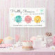 Cute retro vibe balls of yarn with happy faces and holding crochet hooks on this craft show banner for a wall or table, personalized with your text, fonts, and star color scheme.