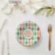Enjoy a fun retro look reminiscent of the circus with personalized party plates in a vintage harlequin design with shades of teal, mint, red, pink and beige. Enter your party honoree's name in the design template. You may change the wording, fonts, font sizes and font colors if you like.