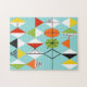 This Retro Harlequin Pattern Puzzle is mid century modern style at its finest. The vintage inspired design features an aqua background with rows of triangular shapes forming a harlequin pattern. The two-toned diamond shapes are yellow, white, red, orange, black, green, and white with black accents. But wait, there’s more! There are also orange ovals, green ovals with black starbursts, and outlines of black diamonds. Time marches on, but you’ll feel like you’ve found a kitschy blast from the past with this colorful geometric treasure.
