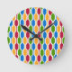 This clock has a mid-century modern design of retro hexagons in red, green, blue, and gold.