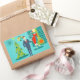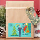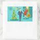 These Retro Holiday Cartoon Couple Stickers will put you in the holiday spirit. The design features a turquoise background with teal bricks and an olive green, cone fireplace. There is a teal, starburst wall clock and a two-tier pendant lamp in shades of yellow, blue and black. A green Christmas tree is adorned with a yellow star and teal ornaments. Front and center, there is a distinguished, martini-swilling businessman in a blue suit and orange tie. To his side, his blonde bombshell of a trophy wife is wearing a red wiggle dress and a Santa hat while holding a tray of martinis. Fa-la-la-di-da!