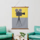 Wall tapestry features a retro Hollywood tripod style movie making camera on a modern yellow and gray colorblock background